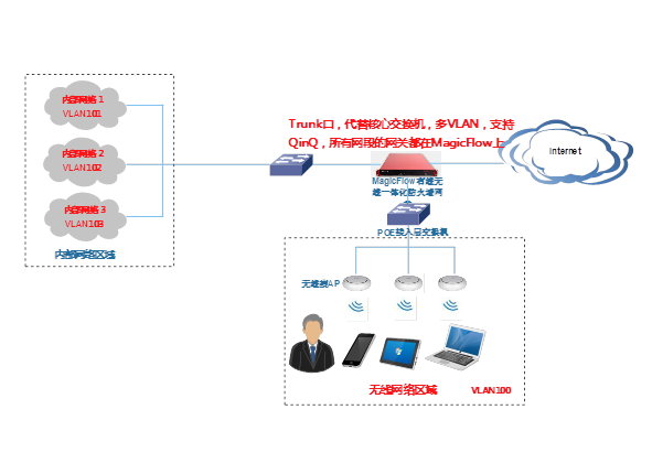 ● 两台 MagicFlow有线无线一体化防火墙网关通过LAN Switch 设备连接内部网络用户;
