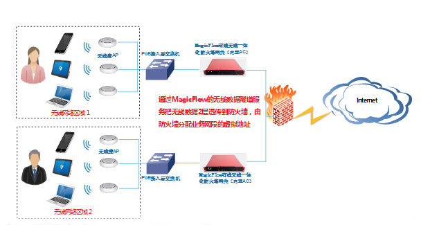 MagicFlow有线无线一体化防火墙网关包括强大的无线组网能力,内置AC隧道服务和配置服务,可以本地转发、集中转发、2层转发AP数据流、集中配置AP网络。以下以 MagicFlow®作为2层数据集中转发AC使用的网络为例:
